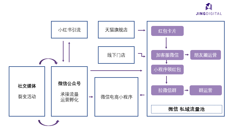 完美日记最初瞄准用户画像高度契合的小红书,仅在该平台便沉淀了百万粉丝与十几万份种草笔记,后期,完美日记将内容通过加工分发至抖音、公众号、微博等其他渠道。大量的内容分发让完美日记快速占领消费者注意力,在线上任意渠道购物商品的用户,都会在快递箱收到“添加微信领红包”的小卡片,同样,线上门店也设计了“加导购微信免费领美妆蛋”的导流设计,这样一来,来自不同渠道的用户都被统一沉淀至微信私域流量池,形成了品牌可长期销售的客户力量。