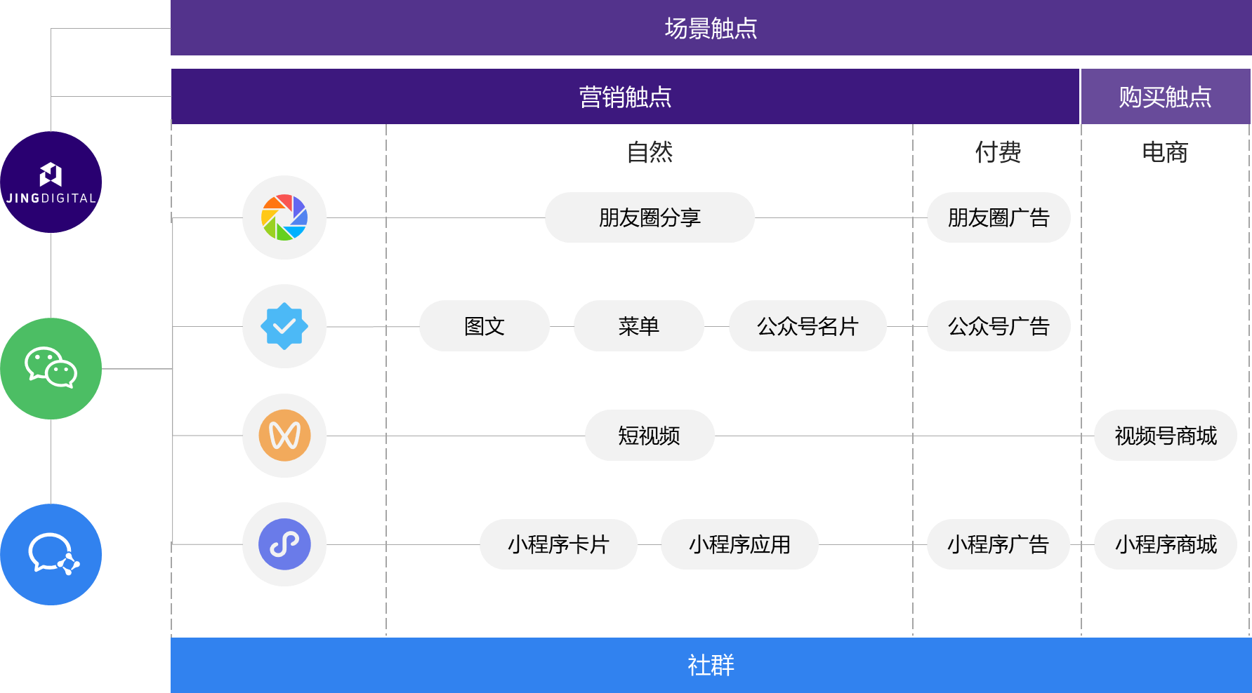 微信营销的几大渠道包括:朋友圈、公众号、视频号、小程序和社群,而根据推广的性质,又可以将其细分为自然推广和付费推广。