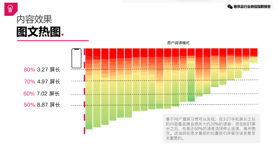 此外,基于此报告「文章热力图」对奢侈品牌内容推送中用户停留时长的统计分析,有20%的用户会在2.56屏后退出页面,在播放了6.82个屏幕后,大约50%的读者将会退出。因此,文章长度以及重要内容优先显示都将是品牌方需要考虑的地方。在根据消费者的喜好将其细分为不同维度受众群之后,品牌可以采取进一步的措施:针对不同的用户群体进行测试,以确定最佳的内容定位、内容发布的最佳时机、内容的排布顺序等。