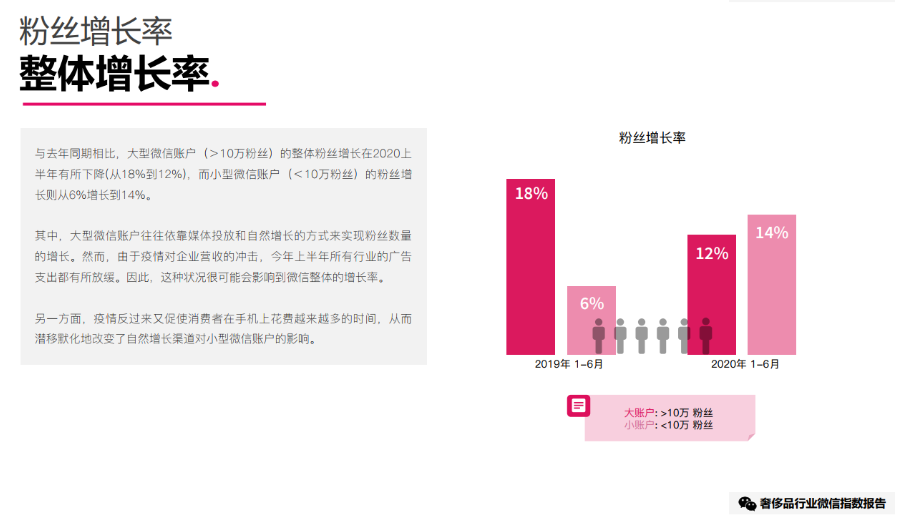 从2019年与2020年的整体情况来看,粉丝量在10万以上的账号年增长率从41%下降至34%,粉丝量在10万以下的账号年增长率从34%上升至50%,虽然整体仍呈增长趋势,但随着微信社群的规模越来越大,市场逐渐趋于饱和,如何保留并获取新的粉丝,仍是品牌亟待考虑的重要问题。