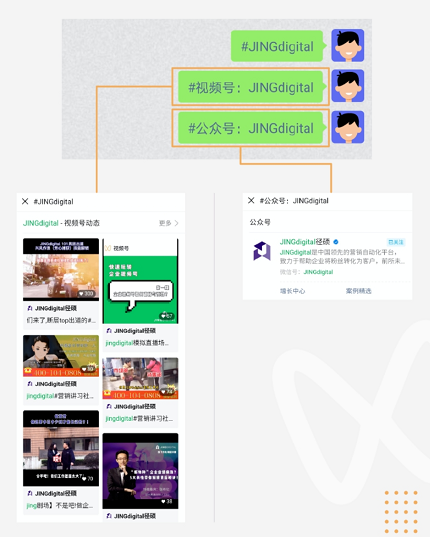 用户只需在与好友聊天的对话框中,加上「#视频号:XXX」或「#公众号:XXX」的标签,就能够快速跳转到视频号或公众号页面。