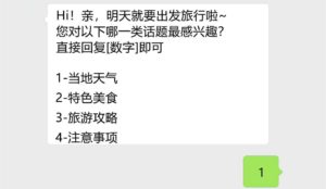 客户通过该品牌购买旅游产品,行程开始并到达目的地后,打开微信服务号,定制化菜单自动跳转成为其所在地的资讯列表,让客户及时、快速、便捷地得到最想要的信息与帮助,给予客户最贴心的旅行指导。