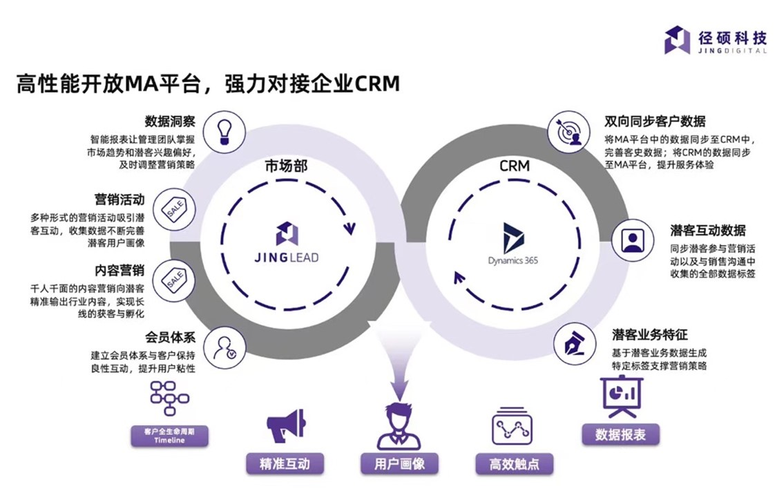 不仅如此,径硕科技凭借自有API接口及数据自动化技术,可以帮助企业全面打通第三方系统、自有系统和JING平台之间的数据,构建营销、销售、客服各场景之间的数据联通闭环。