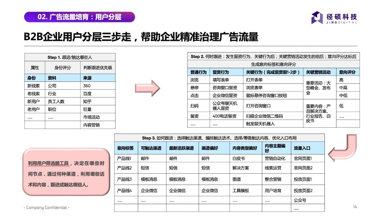 Step 3. 通过何种渠道,用哪些内容触达该人群:根据人群的意向标签、可触达渠道、最新活跃渠道、渠道偏好、内容偏好等,选择沟通的渠道和内容。例如:喜欢工具模板类内容的线索C,由于其拥有产品线2的意向标签,运营人员可以向其发送围绕产品线2性能而产出的工具模板内容。