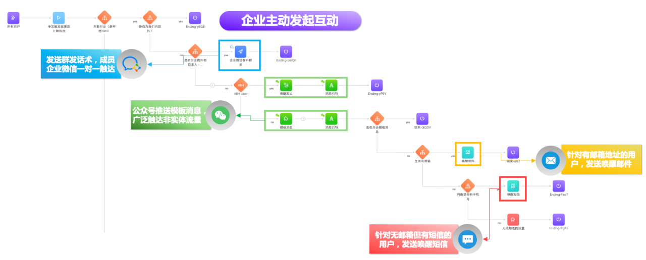 企业可定期针对非活跃用户(已留资,但于一定时间周期内没有在企业各营销渠道内产生互动行为-包括未与SDR沟通)、未留资用户(流量)进行主动触达:根据不同的用户资料、行为等条件进行用户筛选,并配合企业微信、公众号模板消息(可与未留资的流量进行主动沟通的唯一方式)、邮件、短信等培育渠道,按照优先级依次排列,保证每一位可触达的用户都能在至少一个渠道内接收到企业的互动邀请。需要注意的是,互动邀请必须具备足够的吸引力和价值点,如安插内容、活动。