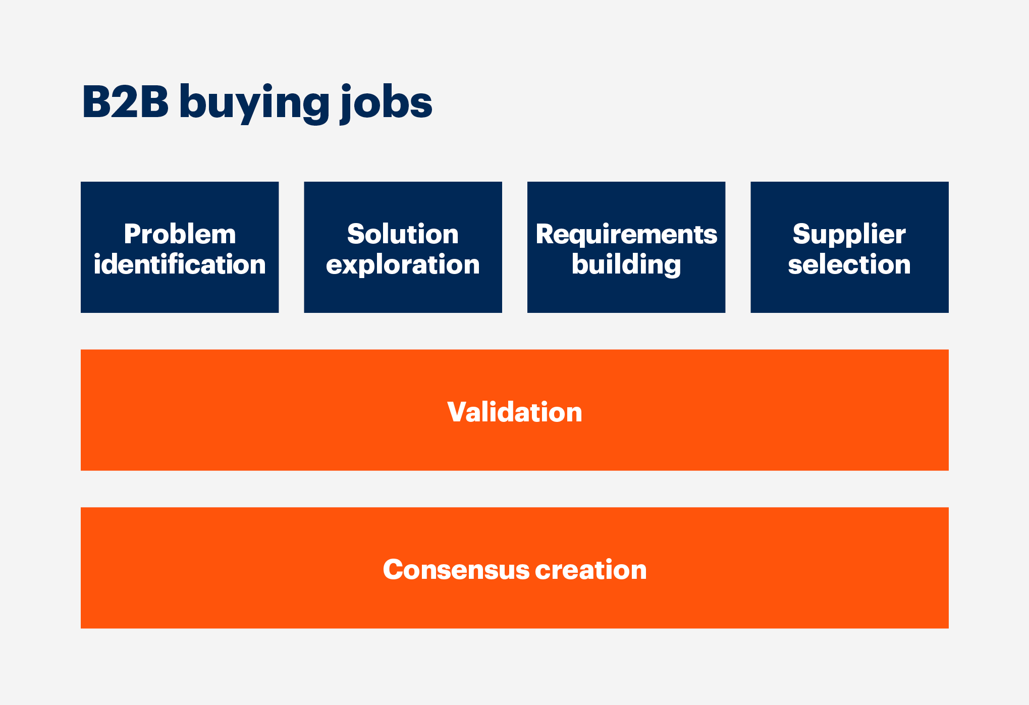 It’s important to keep in mind that the purchasing process is not linear. Quite often the stages take place simultaneously. If you were to draw a real picture of the B2B purchase journey, it would look less like a step by step diagram and more like a big bowl of noodles. Every moment is invitation to review, re-assess and reconsider. The customer will bounce back and forth between tasks until these six tasks are locked in at the same time (refer to the diagram above).